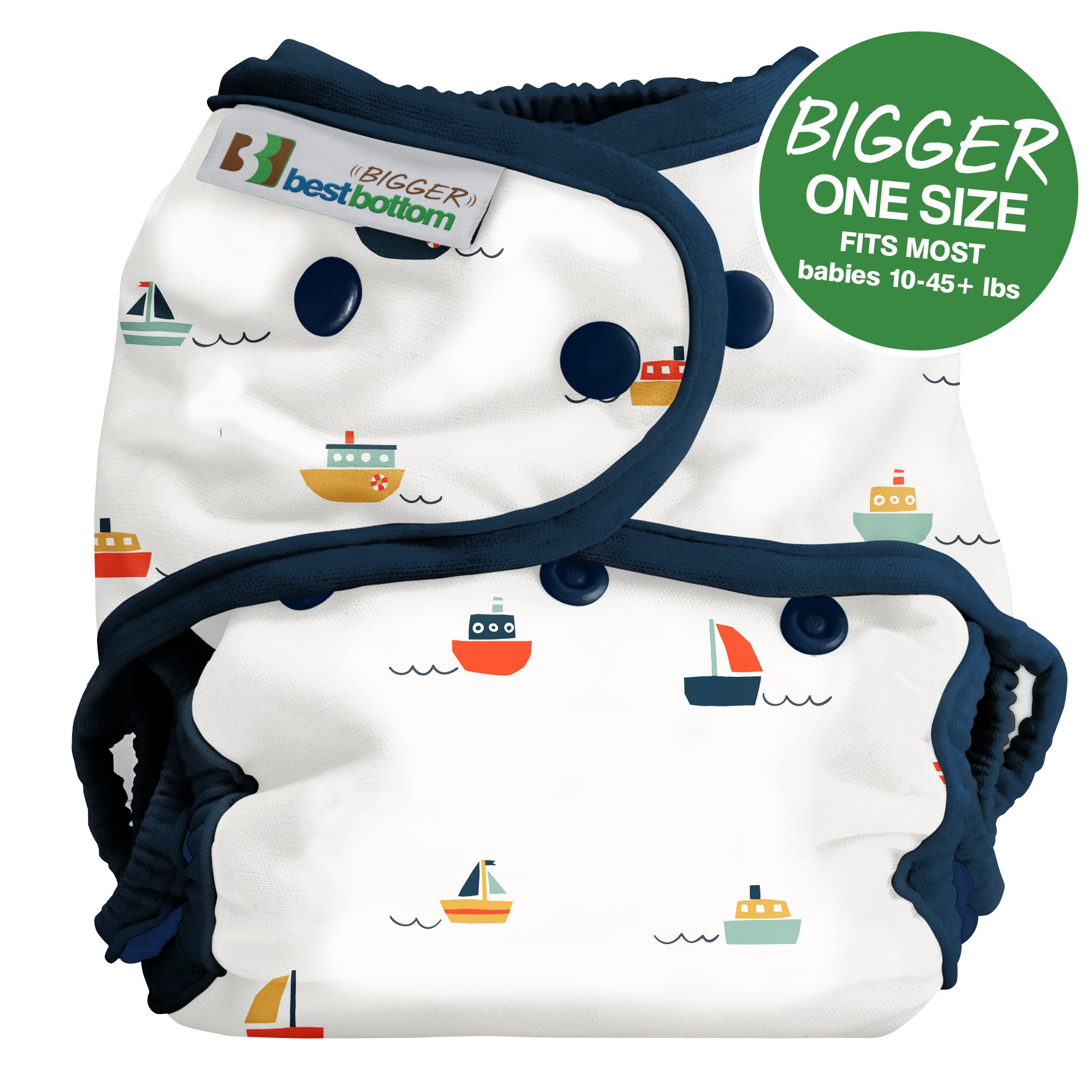 Fits from birth to 35+ lbs. We added special leg gussets to help keep everything in, adjustable rise with four settings, and overlapping closure in both snap and hook & loop. This is a very trim fitting diaper so please be extra careful that none of the insert is sticking out of the shell. Also, after the diaper is on, pull the leg gussets out around baby's legs. This will guard against leaks and help avoid any red marks.