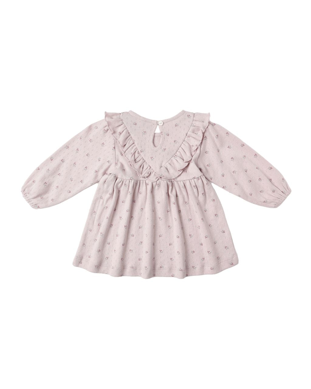 This long sleeve dress in our classic pointelle fabric features delicate V-ruffle detail, a button-back closure for easy changing, and matching bloomers for a sweet finishing touch.