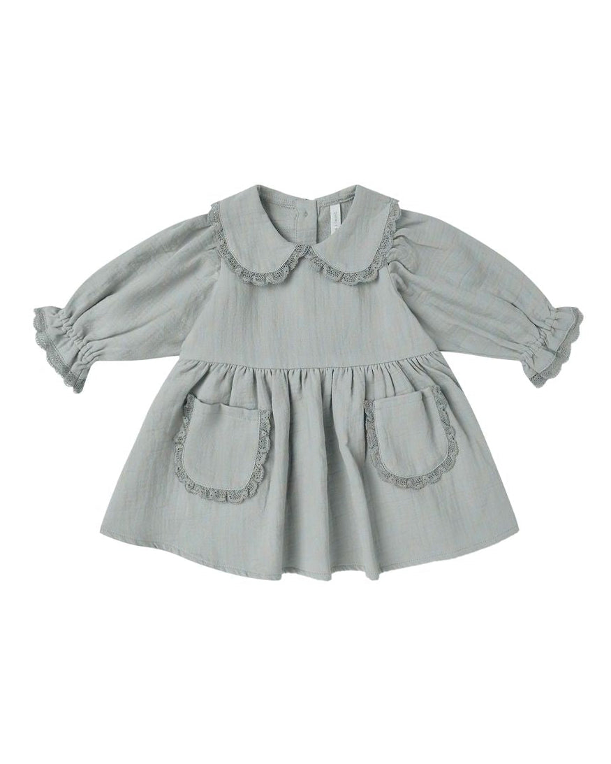 Our Marisol Dress features a Peter Pan collar, patch pockets, and full gathered sleeves—all adorned with delicate lace ruffle trim—and coconut buttons at the back for easy dressing. Coordinating bloomers included with all sizes.