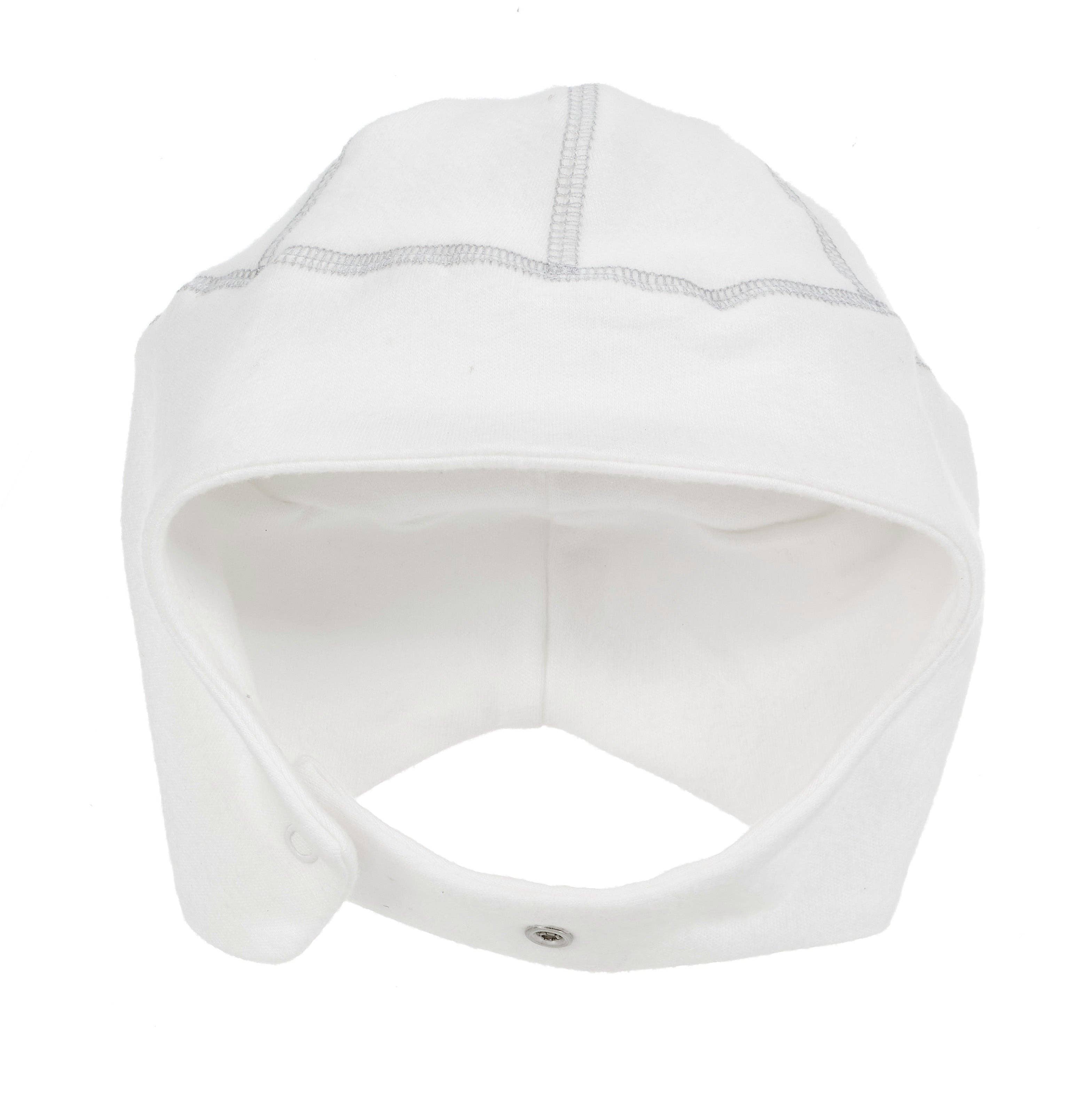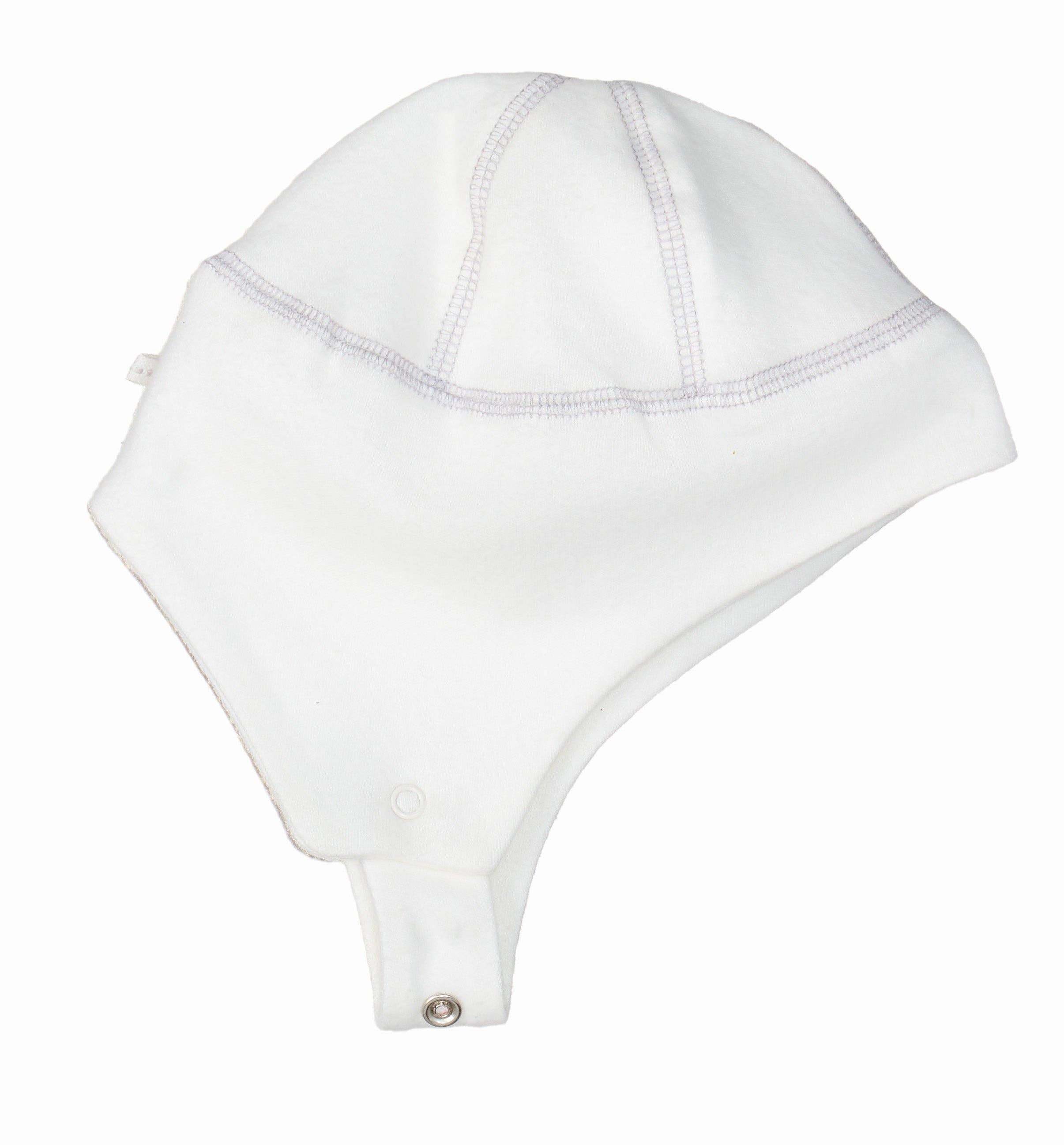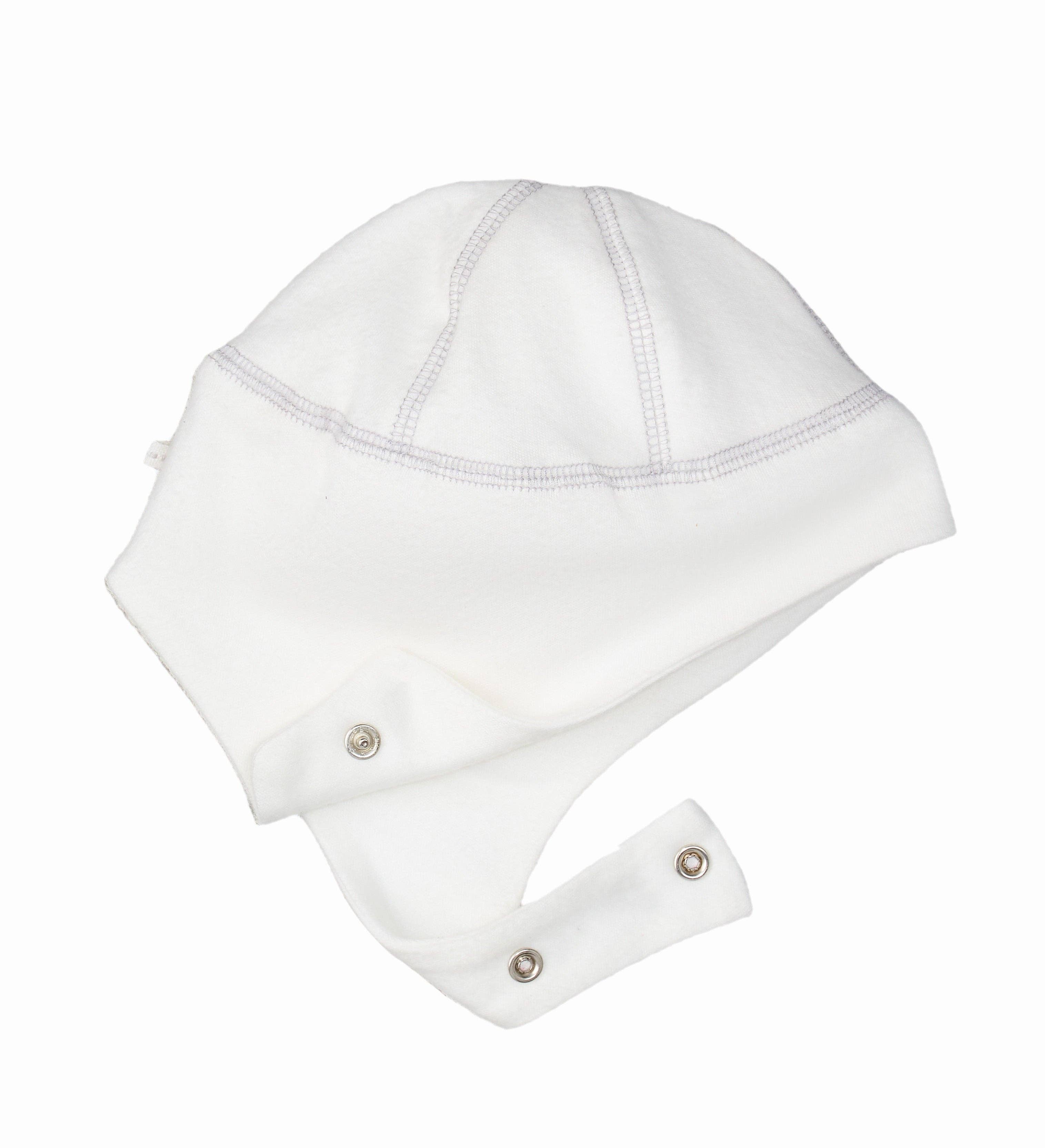 This organic brushed sherpa ear flap hat is a must-have for the chilly season! This winter hat will keep your baby's head and ears nice and warm with snaps under the chin for extra security and snug fit. Coordinates with the rest of our Winter White Sherpa Collection.